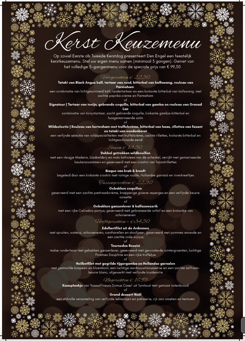 Ontdek ons feestelijke kerstmenu, samengesteld om iedereen te verrassen. Van verfijnde voorgerechten tot smaakvolle hoofdgerechten en feestelijke desserts: elk gerecht is met zorg bereid om jouw kerstavond onvergetelijk te maken.